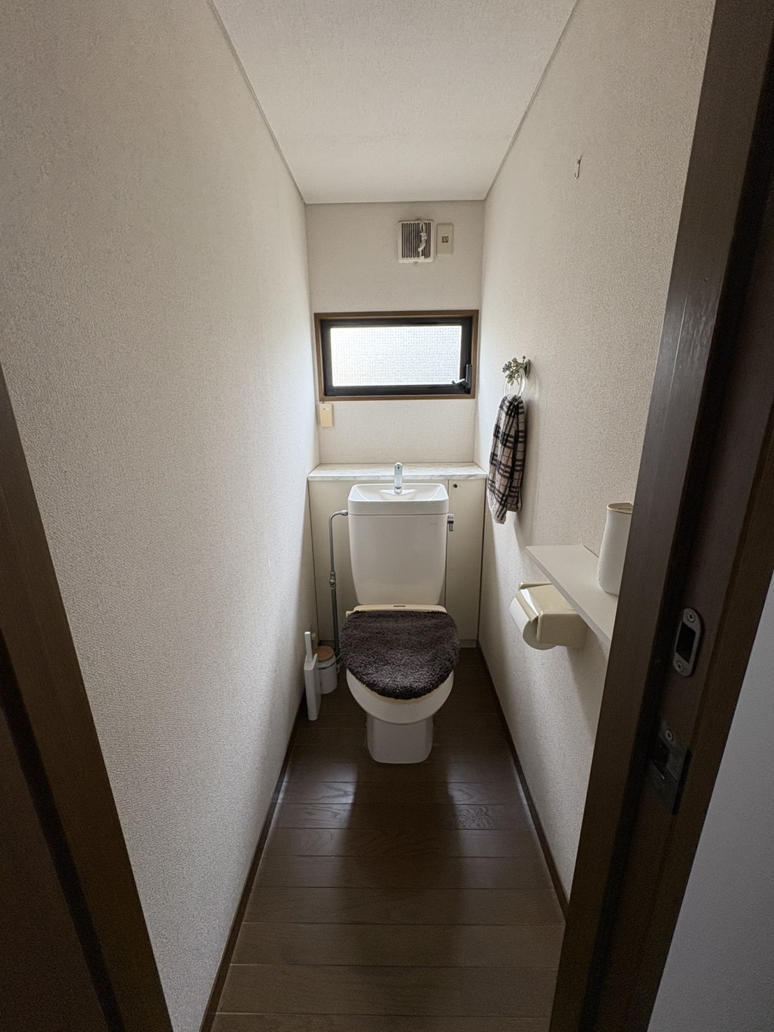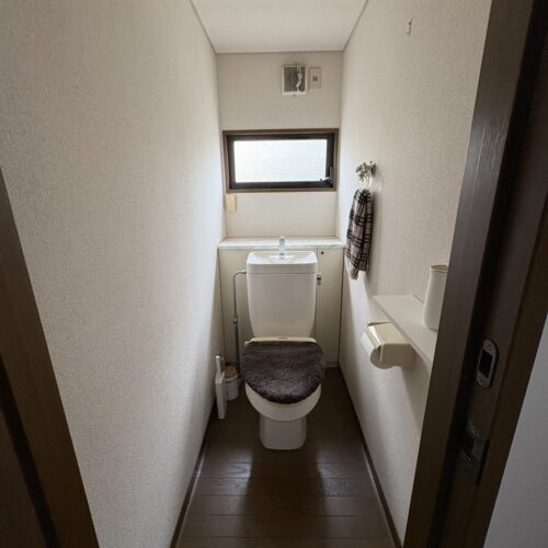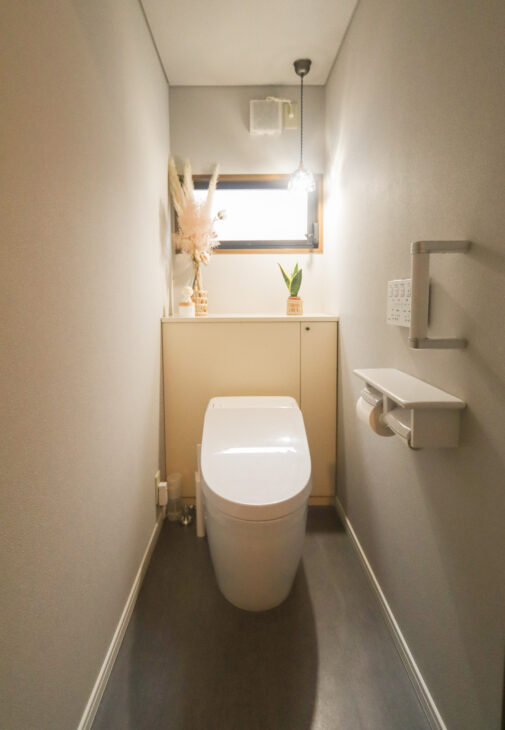 トイレには、既存の収納棚を活かしながら、そのペンダントライトがしっかり目に入る位置に設置しました。