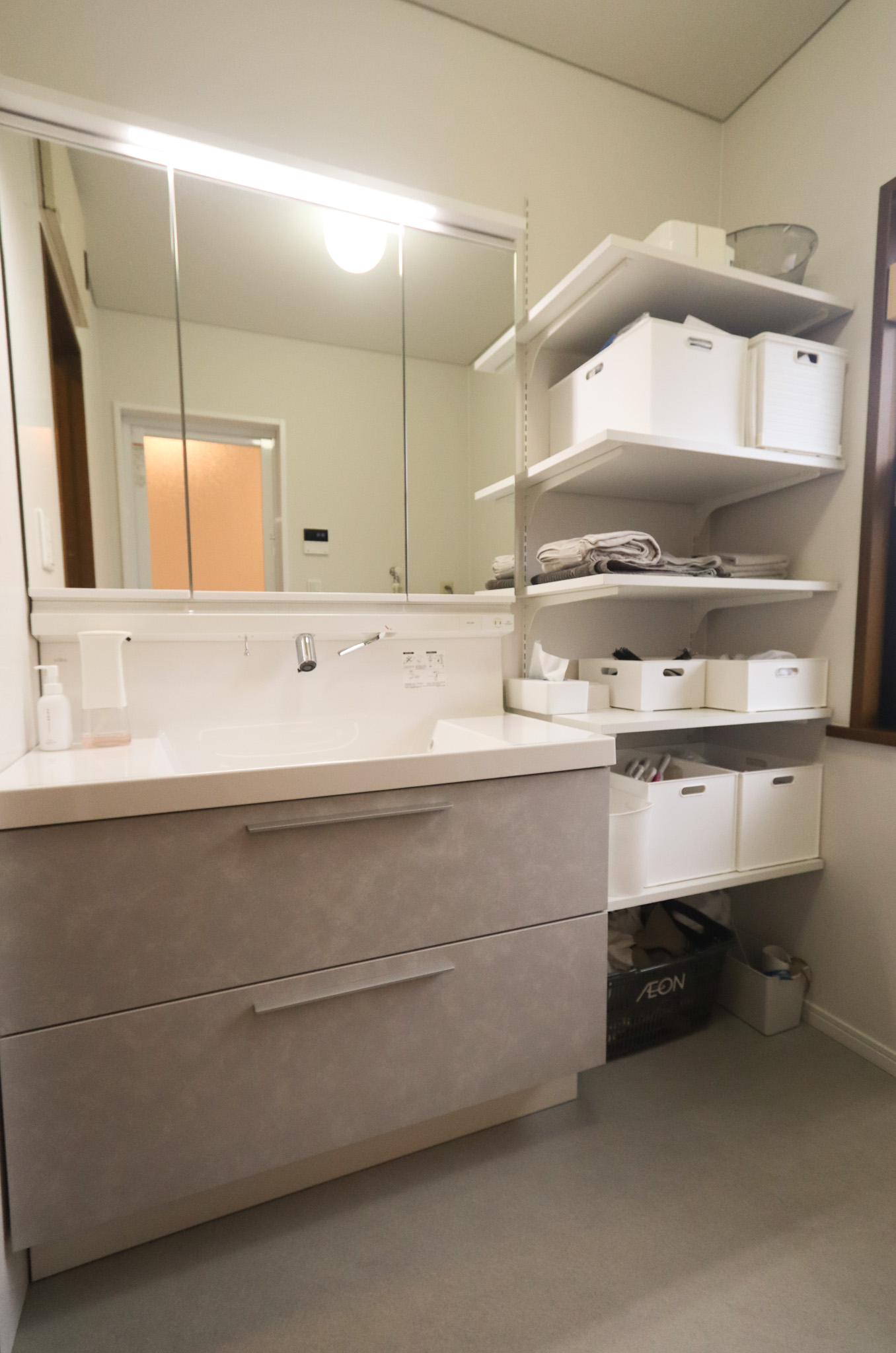 あえて洗面台のサイズをコンパクトにし、造作の収納棚を設置。