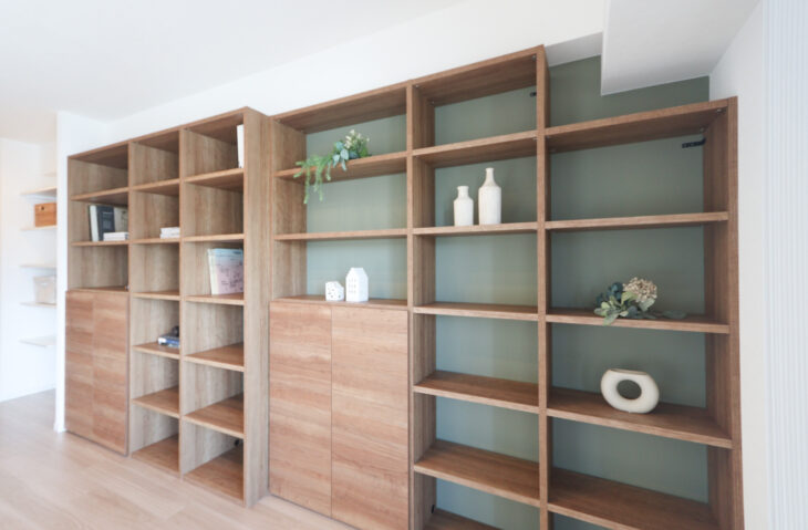 リビングには奥行の違う壁面収納を設け、アルバムなどの大きいものも収納できます。