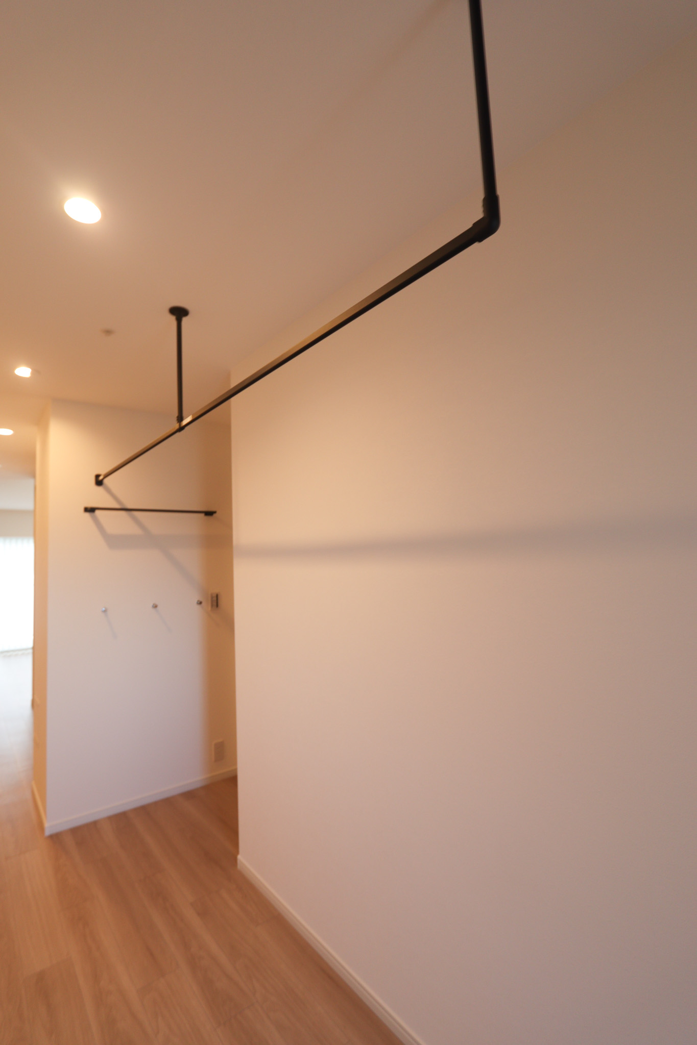 奥にもアイアンバーとフックがありますが鞄などの小物を掛けておく場所として活用。